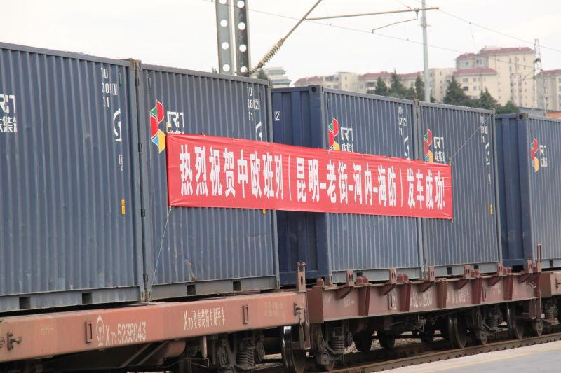 12日下午,由昆明开往越南海防的一辆满载850吨货物的货运班列从昆明王家营西集装箱中心缓缓出发,标志着中国到越南国际货运班列(昆明—老街—河内—海防)正式开通。